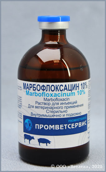 Главная / Каталог ветеринарных препаратов / Противомикробные средства / Противомикробные препараты - фторхинолоны / МАРБОФЛОКСАЦИН 10%