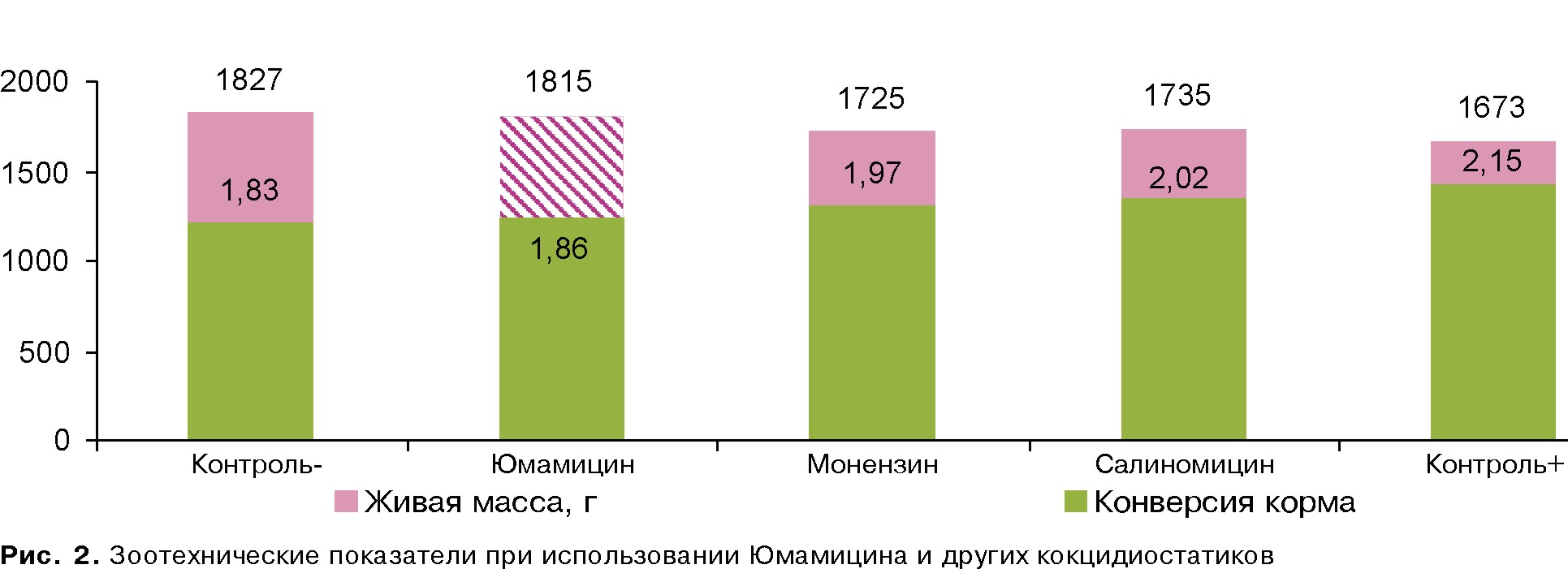 Юмамицин продемонстрировал наивысшую профилактическую эффективность среди исследованных ионофоров по степени предотвращения поражений кишечника, хотя ни в одной из групп и не было зафиксировано падежа поголовья. Зоотехнические показатели продемонстрировали высокую эффективность Юмамицина в экономическом аспекте (рис. 2).